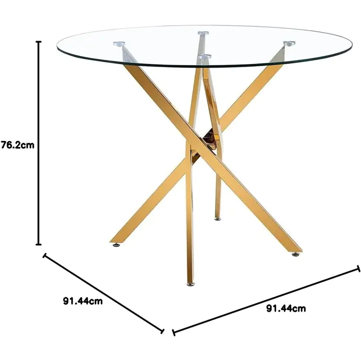 This round glass dining table blends modern style with practical elegance, making it a perfect addition to any contemporary space. The clear tempered glass top brightens the room and is easy to clean, while the round shape creates a cozy, inviting dining atmosphere. Its crossed gold metal base adds a warm, sophisticated touch, balancing the table’s light, airy look with strong, stable support.