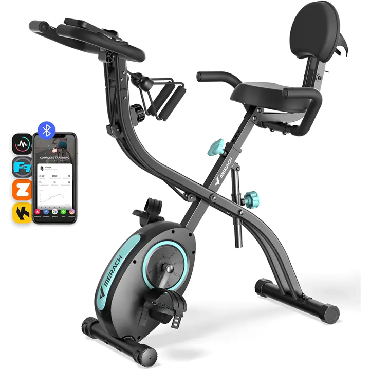 MERACH folding exercise bike built with a sturdy alloy steel frame for stable indoor workouts and easy storage. Supports up to 300 lbs (136 kg) with 16-level magnetic resistance and quiet performance. Features a large comfortable seat, adjustable height, non-slip pedals, and foldable design. Integrated LCD monitor displays time, speed, distance, calories and heart rate. Includes Bluetooth app integration for tracking. Ideal for home cardio, full-body fitness, weight loss and daily training.