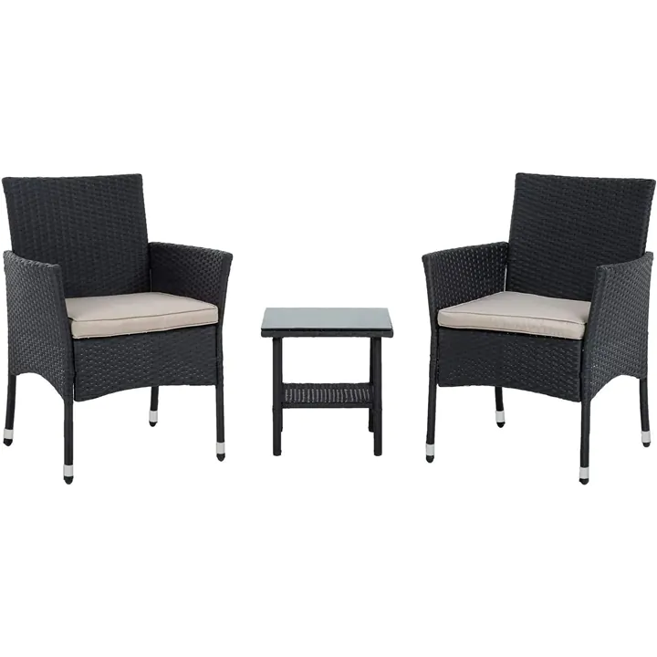 This FDW 3-piece outdoor set in sleek black features two rust-resistant steel-frame rattan chairs and a matching bistro table with a tempered glass top. Weather-resistant PE wicker and powder-coated finish make it durable for balconies, patios or pool-side. Cushioned seats provide comfort while non-slip feet protect your floors. Easy to assemble with included hardware. Chair size approx. 31.5''H × 18.5''W × 19.2''D and table about 16.3'' × 15.7'' × 15.7''. Ideal for compact, comfortable seating outdoors.