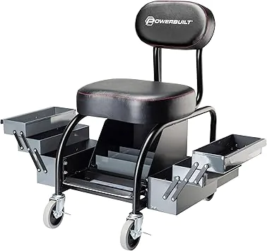 Enhance your workspace comfort with the Powerbuilt Professional Mechanics Roller Seat. Designed for durability, this heavy-duty padded seat features a supportive backrest, sliding storage drawers, and a convenient tool tray. Equipped with can holders and four 4-inch swivel wheels, it offers mobility and organization for mechanics and detailers.