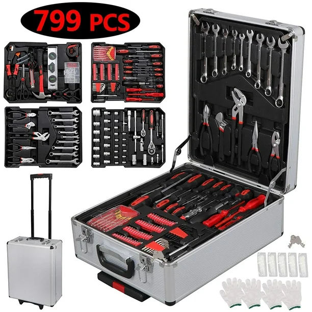 The ProMaster 799-Piece Tool System delivers a comprehensive solution for every DIYer or mechanic. Stored in a rugged trolley case with wheels and telescoping handle, it includes sockets, wrenches, pliers, screwdrivers, hex keys, hammers, extension bars, and more. Every tool nests securely in foam cutouts to keep parts organized and accessible. Perfect for home repairs, auto maintenance, or professional use — mobility, versatility, and durability in one kit.