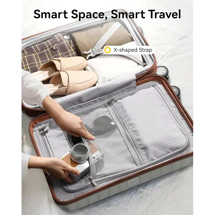 Travel in style with this 3-piece LUGGEX luggage set. Includes expandable carry-on, underseat tote, and durable polycarbonate hard-shell suitcase with 8 spinner wheels for smooth mobility. Lightweight, spacious, and sleek white-brown design perfect for business trips or vacations. Organize efficiently and travel hassle-free.