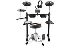 This electric drum kit offers four 6.5' drums and three 10' cymbals with a quiet mesh snare and silicone toms for an authentic feel. It supports MIDI connectivity and includes 150+ sounds with 15 preset kits. Adjustable stands and a foldable design provide comfort and portability, making it perfect for beginners.