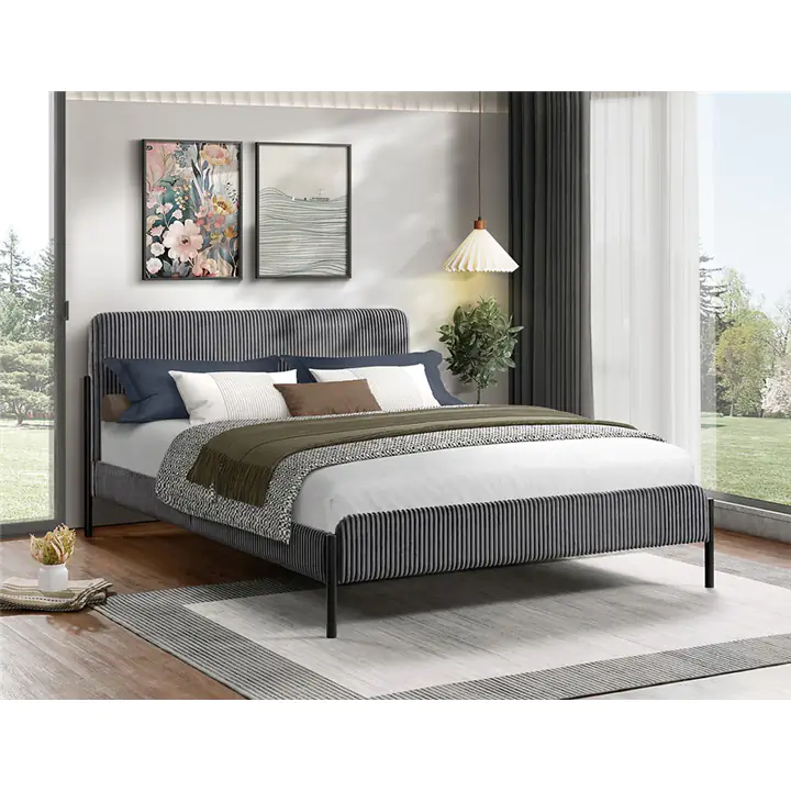 Bring modern style and cozy texture to your bedroom with this corduroy tufted bed frame. The soft grey corduroy upholstery features a channel-tufted headboard for a refined, structured look. Built-in mattress support means no box spring is required, while black steel legs add a sleek, minimalist touch. It’s the perfect balance of comfort, durability, and contemporary design.