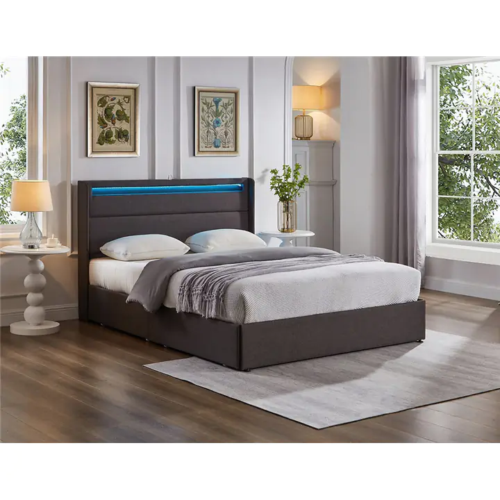 Contemporary Wingback Desgin with Stitching Detail Charging Station with 2 Outlets, 1xUSB and 1xUSB-C Port LED Lights with 7 Dynamic Modes (By Remote Control) Features 4 Large Pull-Out Wire Mesh Storage Drawers Platform Bed Includes Mattress Support (No Need box spring) Grey Fabric