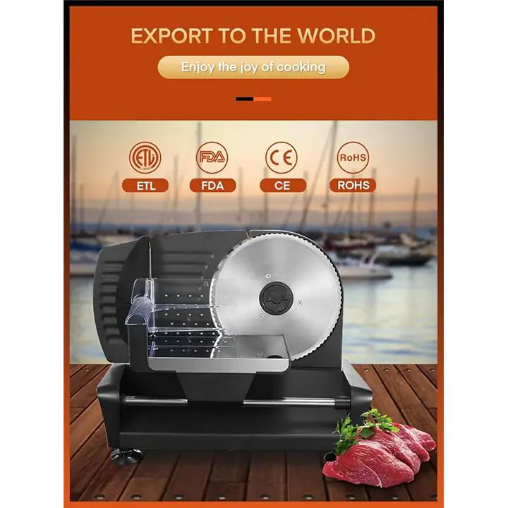 Slice meats, cheeses, breads, and more with this powerful 200W electric meat slicer. Equipped with two 7.5-inch blades (serrated and smooth), it delivers precise cuts with adjustable thickness from 0–15mm. The included food pusher ensures safe, effortless slicing. Perfect for home kitchens, meal prep, or deli-style serving at home.