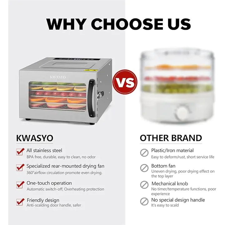 This 6-tray stainless steel food dehydrator delivers 400W of efficient drying power to preserve fruits, vegetables, herbs, and jerky. Featuring a digital control panel with a 0–24 hour timer, it ensures even dehydration while retaining nutrients. Perfect for creating healthy, homemade snacks with professional results in any household kitchen.