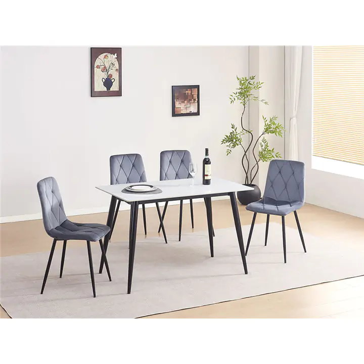 Mettez en valeur votre salle à manger avec l'ensemble de salle à manger en marbre blanc, doté d'un élégant plateau en pierre frittée au fini marbre blanc neige. Son design rectangulaire aux coins arrondis et lisses apporte une touche de modernité, tandis que ses pieds fuselés en acier noir offrent un soutien robuste et une touche contemporaine. Associé à des chaises assorties recouvertes de doux velours gris foncé et ornées de surpiqûres à losanges, cet ensemble allie élégance, confort et durabilité, idéal pour les repas de tous les jours comme pour les réceptions raffinées.