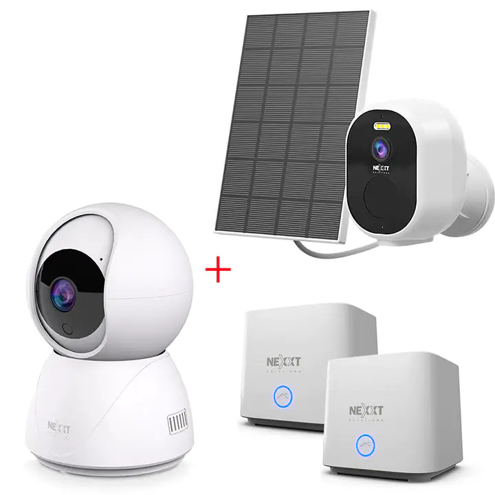 Caméra extérieure Nexxt Smart Home Solar 2K 4MP avec panneau solaire Caméra intérieure Nexxt Smart Home V2 2K PTZ motorisée Routeur maillé Nexxt Networking Mesh Wifi 6 Bolt AX1800 - Blanc (lot de 2) |